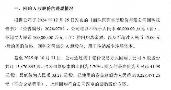 耗资逾5.7亿元回购,用于注销丽珠集团公告显示,截至2025年10月31日,公司通过集中竞价交易方式回购了公司A股股份共计15,376,845股,占公司总股本的比例为1.70%,购买的最高价为人民币41.99元/股,最低价为人民币33.21元/股,已使用的资金总额为人民币570,228,471.25元(不含交易费用)。