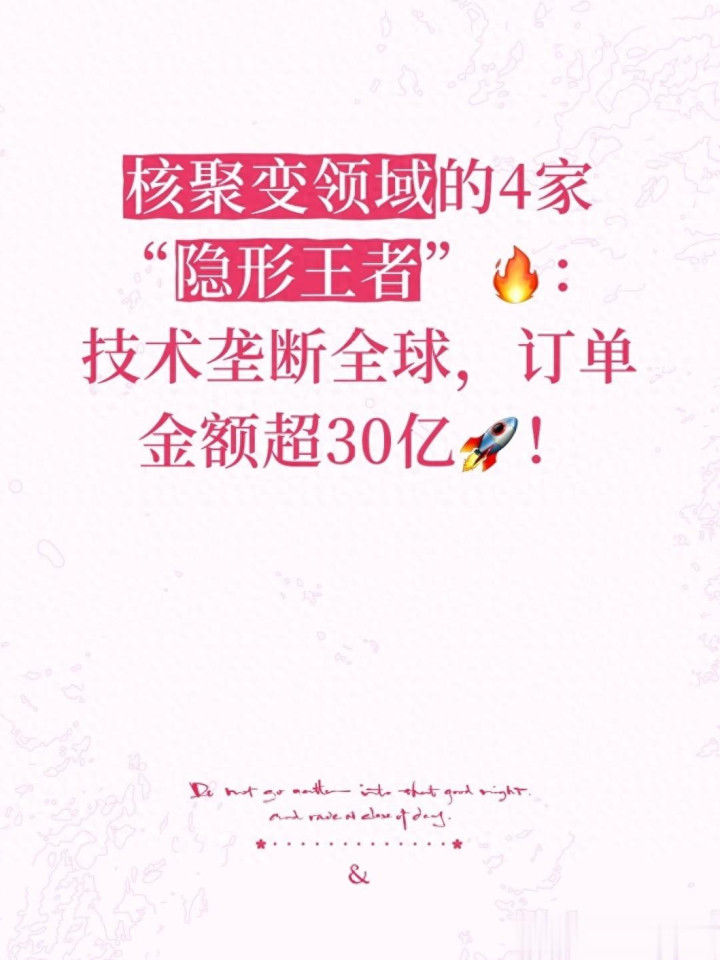 安信配资官网 核聚变领域的4家“隐形王者”: 技术垄断全球, 订单金额超30亿!