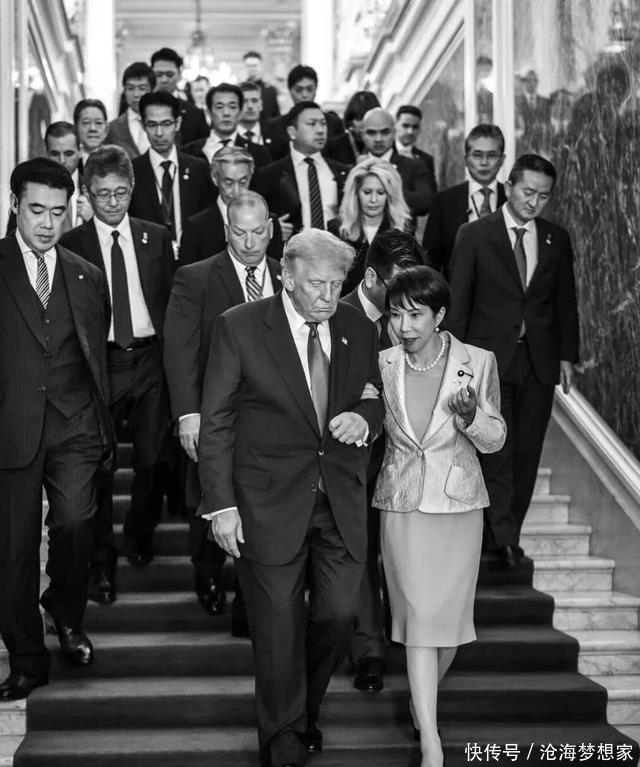 一、两幕辣眼名场面:外交礼仪碎了一地 咱们先把这两组争议十足的场景拿出来细说,每一个细节都透着不寻常的意味。 第一幕:航母上的“雀跃式互动” 互动地点选在驻日美军横须贺基地的“华盛顿”号航母,这一选择本身就释放出强烈的军事信号——要知道,航母可是美国在亚太地区军事存在的核心象征。依据现场流出的视频及后续相关报道,特朗普在台下数百名美军士兵面前介绍高市早苗时,特意着重强调“这位女士是赢家,更是日本历史上首位女首相”。话音刚落,高市早苗的反应便超出了所有人的预料:她没有选择礼貌性鼓掌,而是当场跳起身来,围着特朗普转圈雀跃,脸上的兴奋之情根本藏不住。 要清楚,这里可是美军核动力航母的飞行甲板,周围随处可见荷枪实弹的士兵与精密的军事设备,场合严肃到不容许丝毫随意。即便作为盟友间的友好示好,这种近乎“追星式”的举动,在国际政治舞台上也极为罕见。有军事评论员直言不讳地表示:“在军事基地上演这样的戏码,更像是在向美军‘表忠心’,而非正常的外交互动。” 第二幕:白宫台阶的“挽臂同行” 更让人震惊的是白宫发布的官方照片。照片中,高市早苗与特朗普一同走下台阶,她直接伸手挽住了特朗普的胳膊,身体还微微向特朗普倾斜,姿态亲密得完全不像是两国领导人之间的正常互动。 熟悉外交礼仪的人都清楚,男女政治家同行时,最多只是握手或碰肘示意,即便双方是亲密盟友,挽臂这种动作也基本不会出现在正式场合——就连美国第一夫人梅拉尼娅,在公开场合也很少这样挽着特朗普。难怪照片一经发布,社交媒体上立刻引发热议,有人调侃“梅拉尼娅看到这张照片恐怕都要吃醋”,更有国际媒体直接用“突破外交礼仪底线的姿态”来评价这一行为。关键在于,这张照片还是白宫主动对外发布的,显然是有意向外界传递某种信号。
